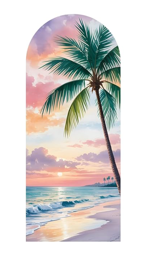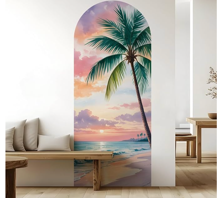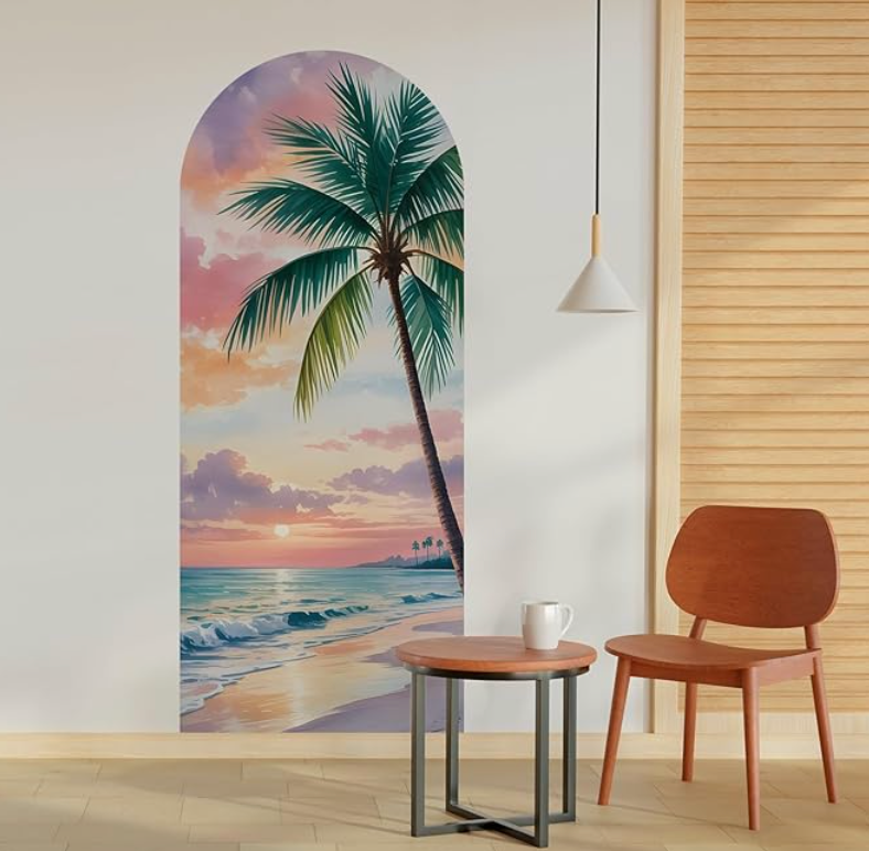 - Tropical Escape at Home – Bring the beach to your wall with this stunning palm tree and sunset mural in a soft arch design.